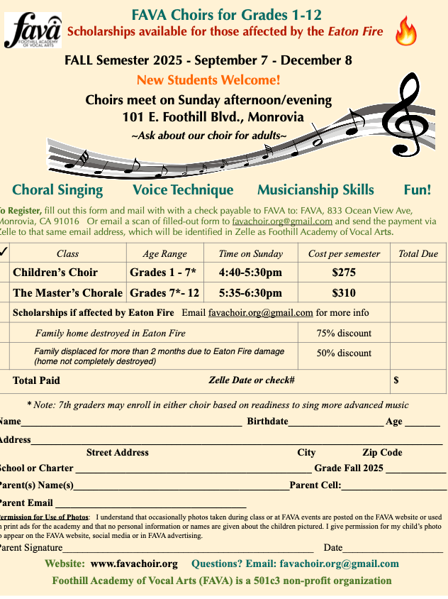 Foothill Academy of Vocal Arts (FAVA) is a non-profit organization that serves the community by promoting the art of choral singing for children, teens and adults of the San Gabriel Valley.